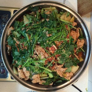 将煮好的肉片和汤盛入装有蔬菜的锅内,把辣椒包均匀撒在肉片上,放入香菜段