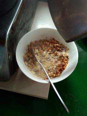 第五步:将烧辣的油快速淋在已搅拌好的辣椒粉上,淋油的同时加入厨邦酱油
