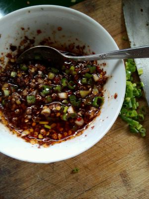 第七步:冷却后,加入少许陈醋,鸡精,最后把之前剩余的葱叶切成段也放进去!