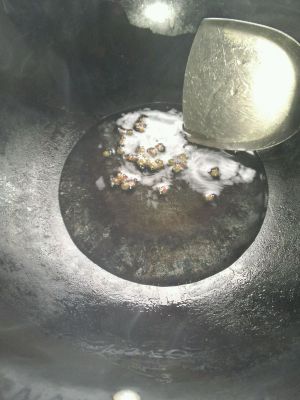 第四步:锅烧辣,倒入食用油,放几颗花椒