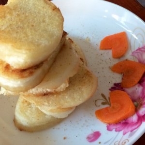 将馒头切成1.5cm薄片、注意菜刀沾一点点水切不易碎