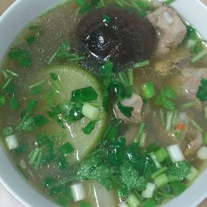 锅里汤煮沸后放入凉水中之前静置的排骨,开锅后转小火炖,一个小时后放入萝卜和香菇,继续炖汤,已经闻到肉骨汤的香味。备好香菜和小香葱~