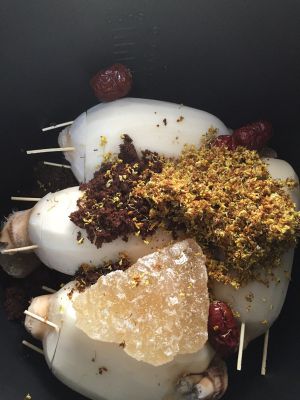 入高压锅,加上红糖、冰糖、桂花、红枣,水稍稍没过藕一点,高压,45分钟