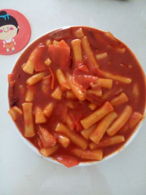 将锅烧热放油以后放入洋葱炒香后放入年糕和胡萝卜之后加入水(最后是跑过海带的水)之后加入适量韩式辣酱,最后是专门的炒年糕专用辣酱,我只有普通韩式辣酱所以放了些糖,口感还是不错的,这时候再加入些鱿鱼或者虾味道会很鲜美!大概5分钟左右(适个人口感)即可出锅