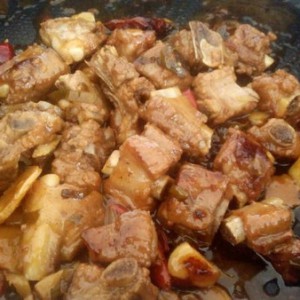 锅底放入葱姜蒜炸锅,倒入排骨翻抄,再加入料酒 酱油 醋 糖,比例是1:2:4:4