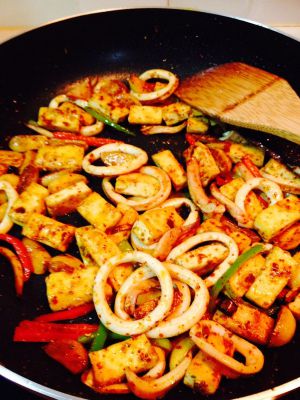 倒入小碟中的调料,中大火快炒匀、出香味了。