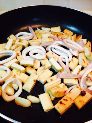 下鱿鱼、豆干,炒到鱿鱼表面干了、蒜金黄色了!