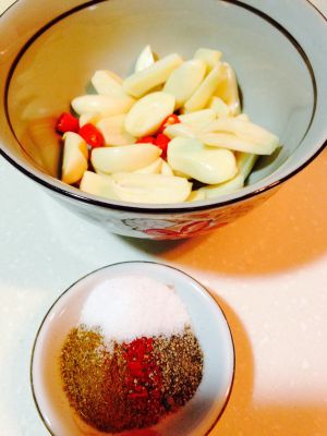 蒜对半切;辣椒粉、孜然粉、盐、花椒粉、黑胡椒粉入小碟调匀。