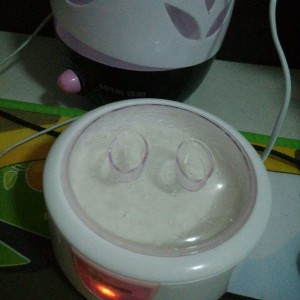 纯牛奶倒入,加菌粉和白沙糖搅拌均匀,放入酸奶机10-12个小时