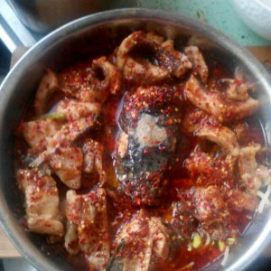 把好人家中的第二包煮鱼料,兑水稀释,煮开,放入煨好的鱼肉块。煮3分钟。煮熟但不能太久,会碎。鱼头多煮会。