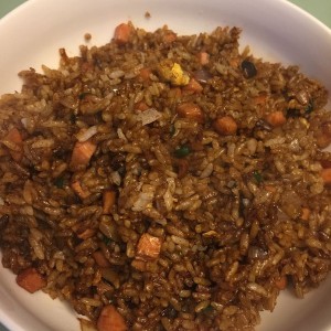 锅烧热放少许油,油热后倒入鸡蛋液,洋葱,香菇,培根,米饭,翻炒5分钟
