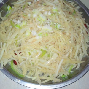 放油,一半葱姜蒜末(留一半出锅用),干红辣椒爆香后迅速加入土豆丝翻炒几下,中途加盐,一点醋。