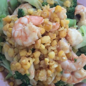 油热放入蒜瓣炒香。先放虾,大火爆炒,然后加入西兰花熟玉米粒翻炒。出锅前撒少许咸盐入味。即可享用。