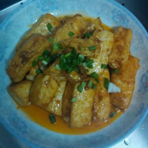 煎到四面金黄色就捞起来,剩下的鸡蛋液也倒在油里煎,煎好的油不要倒,直接把调好的番茄酱倒进去,再把切碎的蒜蓉加进去煮到一分钟就把煎好的豆腐倒下去翻炒下,不用加水和焖,炒到差不多就可以上碟了
