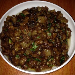 开火,放茄子,放五花肉(肉提前过油),放少许酱油,盐,白糖!