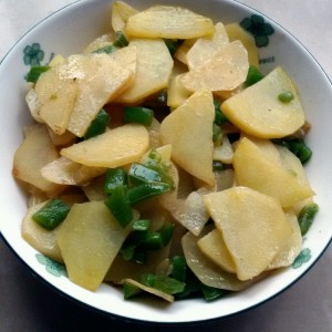 锅加适量油,微炸青椒,待香味溢出时倒入土豆片。