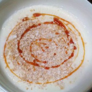 加热4~5分钟,从微波炉取出来,加入适量燕麦,然后封上保鲜膜,继续放入微波炉几分钟,等双皮奶冷却就好了,这一步不用加热。