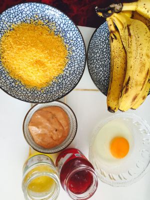 呵呵,我的香蕉都全部起麻点了,然后一些面包糠,一颗鸡蛋,果酱(看个人口味,适当的蘸来吃就好,因为出锅后,我觉得甜度已经够了,所以索性什么都没有加)