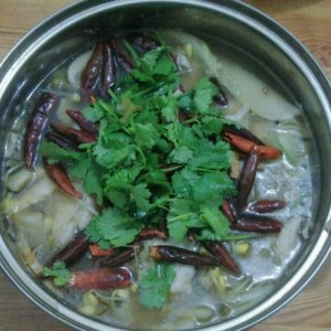 第八步:将干煸好的辣椒淋入鱼片上,再撒上香菜叶(估计辣椒烧得不够,没有红油,所以色相不是太好),图示成品