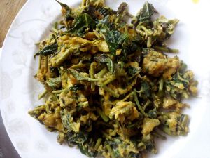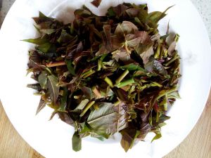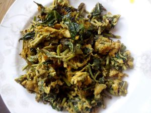 鸡蛋打散,忘拍照了哈,锅里放油烧热后把香椿先放锅时炒几下再把打散的鸡蛋液(鸡蛋液里加一茶勺盐)倒在香椿上炒几下就可以出锅了。