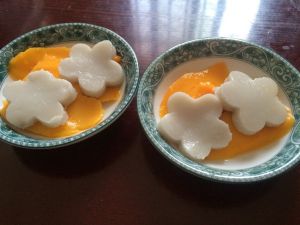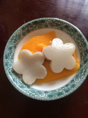 蒸好后出锅凉一会儿就拿橡皮刮子沿边起一圈,铺张保险膜,把盘子倒扣在保鲜膜上,用橡皮刮子帮助把糕取下来,在用模具切成想要的形状就可以美美的装盘了。(模具在切之前一定要沾下水哦,要不会粘粘的哦。)