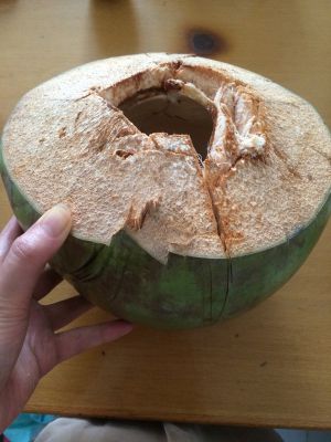 喝完椰汁后劈开壳拿勺子挖出嫩嫩的椰肉。