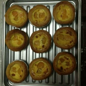 在蛋挞皮内放入蛋挞液(不用太多8成满足够)和黄桃丁(放的数量按口味来)