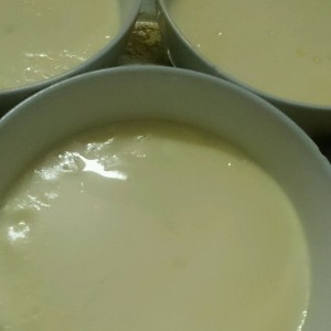 待牛奶冷却后(把碗放进冷水中了加速冷却),将打散的鸡蛋倒进去(记得牛奶不能是热的,不然就成蛋花喇)