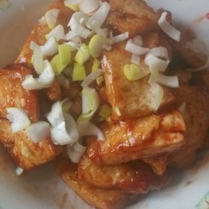将炸好的豆腐放入盘中,锅里留少许底油,油热后放入豆腐,翻炒几下后倒入调好的汁,待豆腐裹上酱汁关火