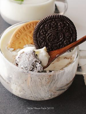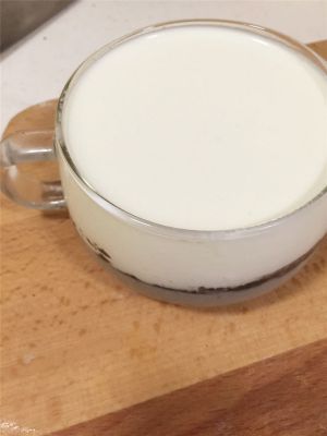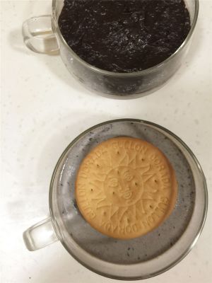 主要是在试味道,所以一杯用了奥利奥 另外一杯就放了一片饼干进去(饼干最好也提前湿润一下 然后轻轻按在黑芝麻糊表面, 不然放入下一步牛奶液的时候会漂起来(其实不放也可以,看个人喜好吧)