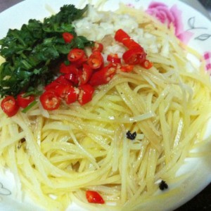 准备辅料 姜切片 蒜切粒 新鲜辣椒切粒 可用辣油代替 小葱切粒 香菜切段 热锅下油姜 和花椒落锅暴香 捞出扔掉 倒入煮好的土豆丝内 放入刚刚切莫所有辅料 倒入 糖 醋 放盐 味精 拌匀 即可