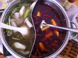 用菜籽油将辣椒末,豆瓣酱、炒果、花椒、八角炒香,加入一半大骨浓汤,放入葱段