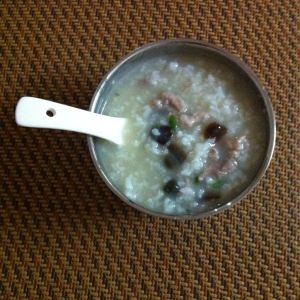 大约等到粥剩下20分钟时,加入瘦肉和皮蛋,搅拌一会,在加入盐2小勺,味精2小勺,糖半小勺,麻油2ml,葱花,搅拌后继续煮完20分钟就完成了。