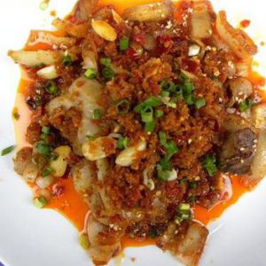 2. 肉捞出,放凉后,用刀切成薄片。锅中放油,烧热后,将五花肉片放入,中火炒至焦香。之后放入渣海椒继续翻炒,直到渣海椒出味。最后放入青蒜段,再次翻炒几下即可出锅。