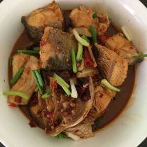 滑入腌制好的鱼块,大火翻滚十分钟转中火煮十分钟,调入一点点盐,加入水淀粉收汁,出锅前撒上葱花即可出锅装盘