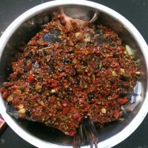这里剁椒和豆豉是炒过的。下入茶油,油热下豆豉,用小火,以防糊锅,下剁椒,炒出香味或煸出红油即可。均匀的铺在鱼头上,撒下紫苏。