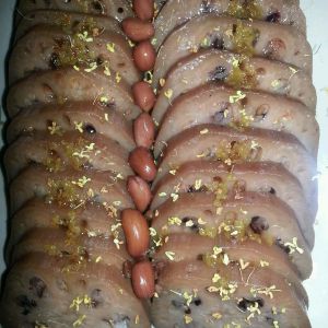 将凉了的藕节切片,装盘,浇上之前熬煮的汤头和糖桂花。