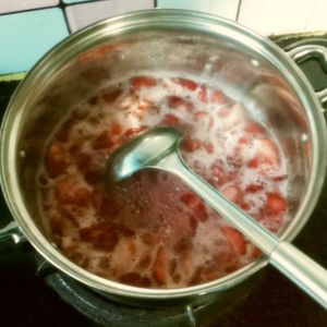 腌制完成后,直接倒入锅中,慢慢熬制,用铲子将草莓切开,用铲子边搅边熬