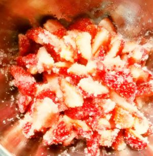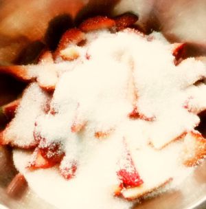 将细砂糖倒入草莓中,拌均匀