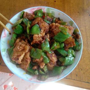 差不多时放入切成小块的青椒 ,炒熟装盘