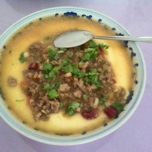 蛋熟了就放前面炒熟的肉沫,洒上葱,放点香油行了!我放的是川芎叶代替的,一样很美味!