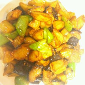 锅里热油放蒜,等蒜香飘出来后倒入土豆茄子和青椒,翻炒片刻倒入调好的料,翻炒均匀即可出锅,第一次做感觉很好,主要是调料要谨慎 喜欢粘稠的可以多放些淀粉。