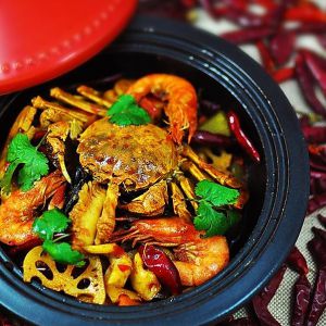 再放入螃蟹和大虾,此时开大火,不断翻炒。