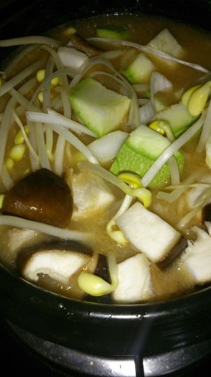 搅拌均匀放入西葫芦,香菇,豆芽,并且撇去浮沫
