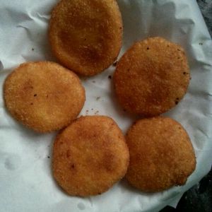 起油锅烧热,把裹好面包糠的南瓜饼放锅里煎,约3分钟就可以起锅,放吸油纸上,吸掉一些油,这样吃的时候会不太油腻。