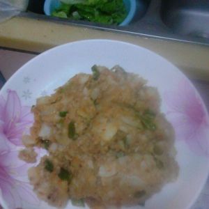 放入土豆,拌炒(个人喜欢把土豆泥弄碎)锅底会粘上一层,是精华