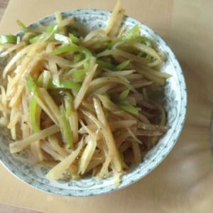 热锅放油,油热时放入干辣椒爆香,放入控完水的土豆丝,接着放入青椒,快速翻炒,加入生抽和醋,再放入适量盐,快熟时放鸡精出锅。