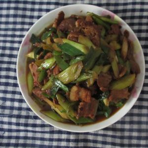 郫县豆瓣酱一小匙剁碎炝锅,放焯过水的肉片翻炒加少许花椒面至断生,加高汤小火慢炖,最后放蒜苗翻炒加蚝油鸡精盐出锅。
