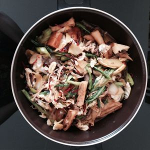 在放入控干水的鱼皮脆、墨鱼丸等炒一会