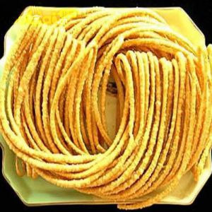 将面条的一头夹在左手的虎口处,用右手捋住面条,往左手并排伸出的4个指头上缠9-10圈,再取一双筷子,撑在缠好的面条圈套内,用双手拿住两头,往外抽至20厘米左右长,投入七成热的油锅中,刚一见热,立即将一头扭一个半剂,然后抽出筷子,在油锅中炸至定型,成柿黄色捞出即成